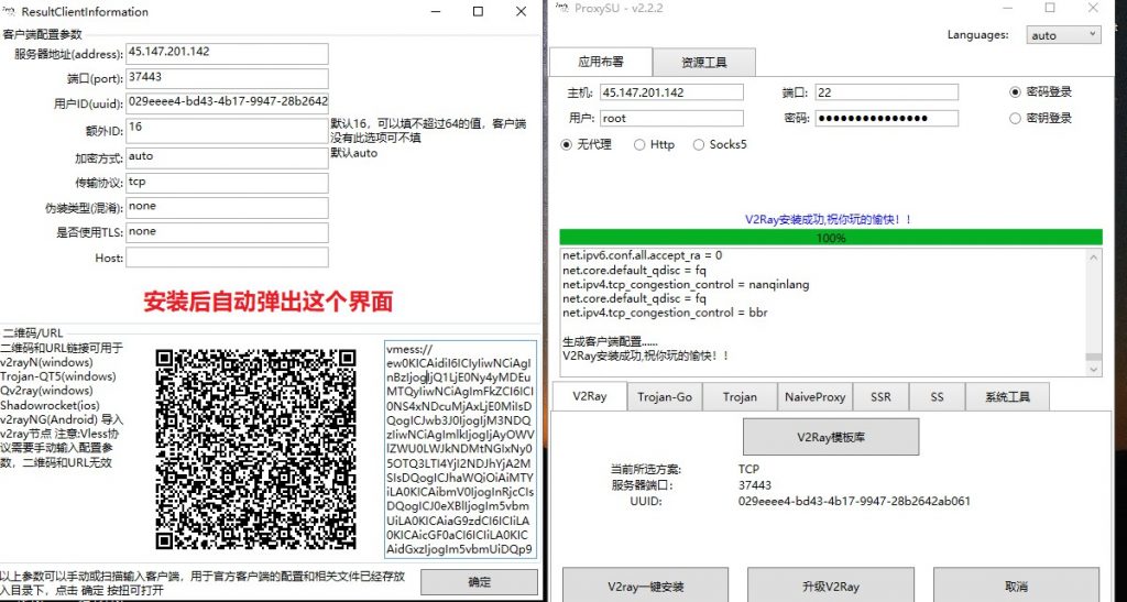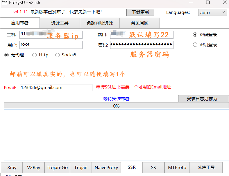 填上ip和密码,端口22和root默认。注意:ProxySU-v2.5.7版本,就算没有域名,在界面上也需要填写1个邮箱,可以是真实的,也可以随便填写1个,比如[email protected] 不然软件无法正常运行。