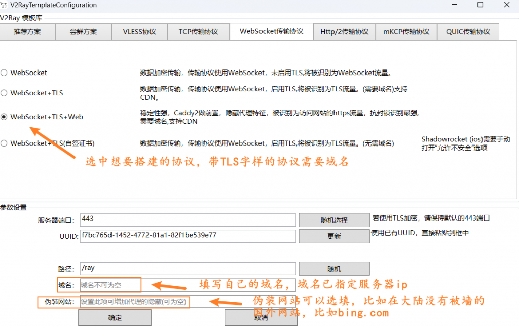 伪装域名可以不填,如果填写,可以填写一个在大陆可以访问的域名,比如bing.com、www.microsoft.com等,伪装域名前面不要加https://